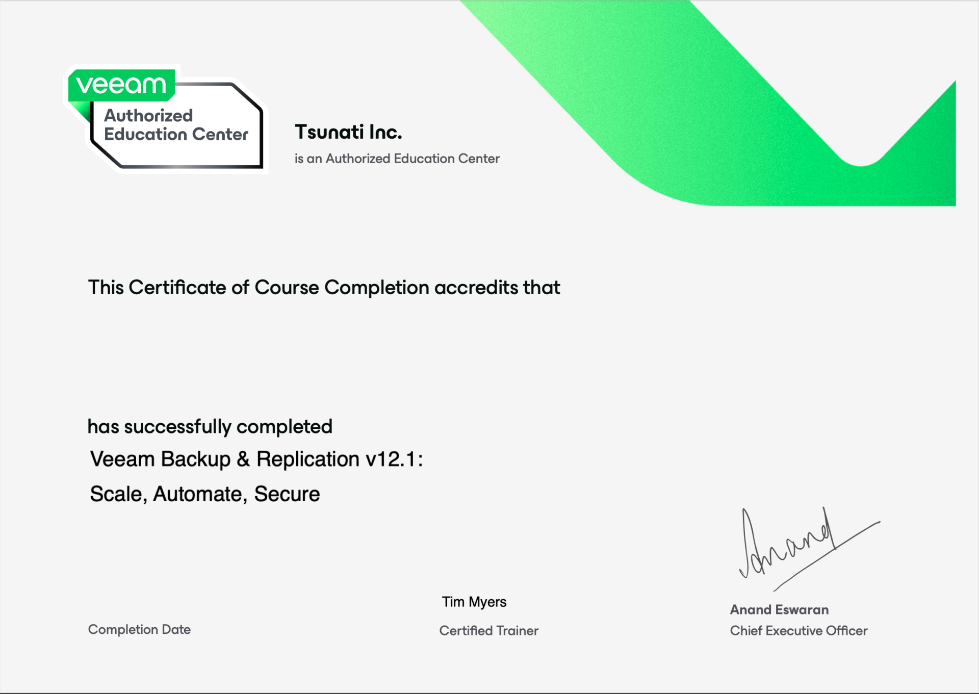 Students who complete the Veeam Data Platform VDP: Scale, Automate,Secure course by itself will receive a certificate of completion.